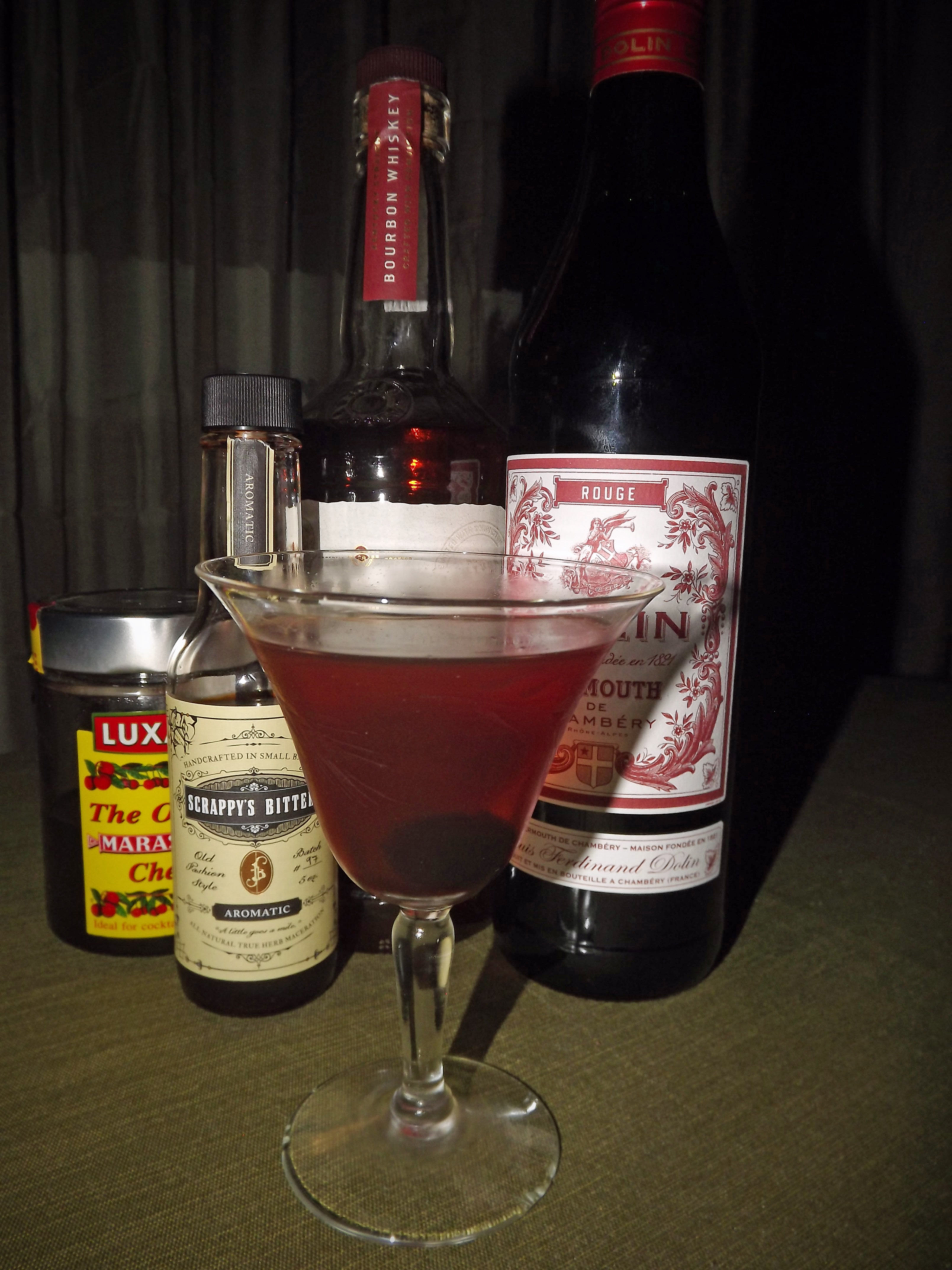 Straight build in an iced tumbler. Garnish with a single cherry on a pick and balanced on the edge of the glass.