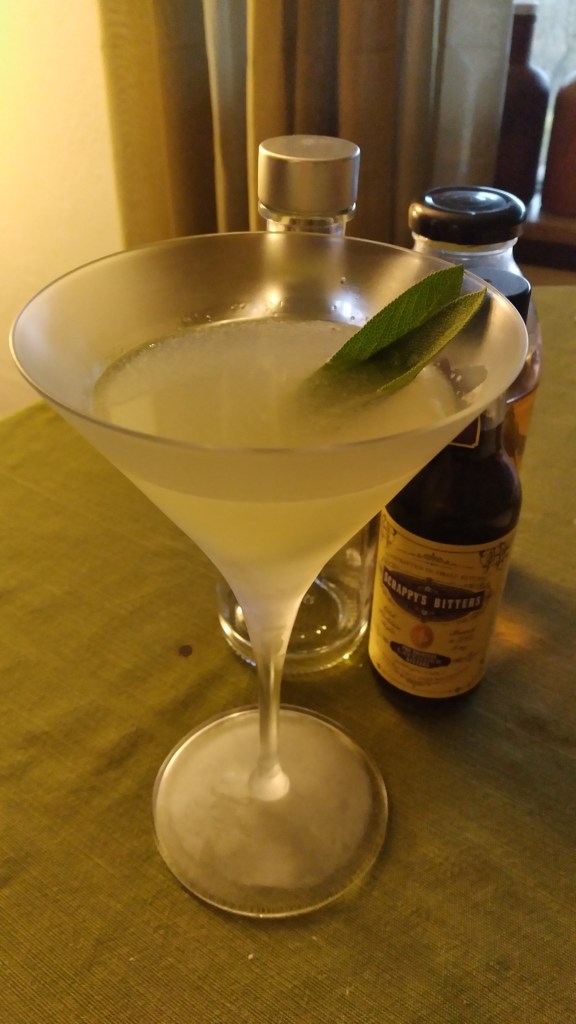Visually you’ve got a classy presentation with a classic “cloudy” sour color and a garnish of fresh sage (not optional this time). The garnish in this case adds a bright floral aroma to the cocktail. Without it you only have a faint citrus to smell. As flavor is not only about taste but also about smell, a nose full of sage leaves makes this a very inviting cocktail. For your inner palette however, you’re greeted with a slight sour, but it’s not over powering. Mid palette the drink transforms and opens up into a sweet citrus and vodka that you’d expect from the standard lemon drop. The finish is where everything comes alive though. The sage and lemon create an earthy and complex flavor balanced out but the whisper of lavender at the end. If you were unaware of the bitters used while drinking it, it’s unlikely you’d pick out that what it was.